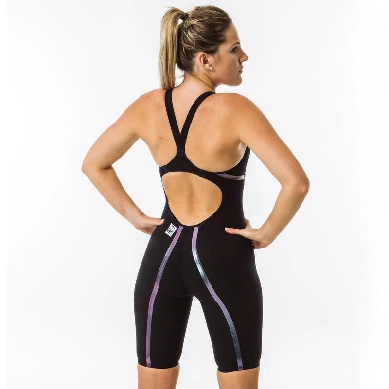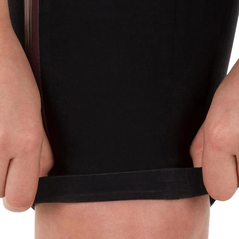 Le fasce antiscivolo posizionate alle estremità (cosce) impediscono al tessuto di fare pieghe. Il prodotto rimane al suo posto nei tuffi e nelle virate, copre il corpo durante la gara e limita la resistenza all’avanzamento.